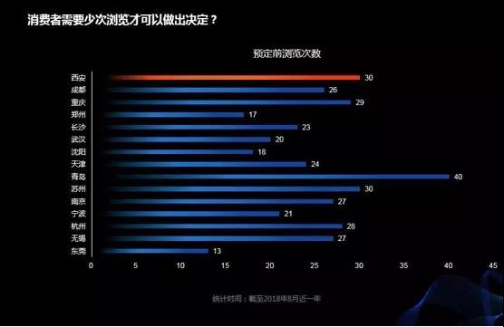 從(cóng)消費(fèi)者預定西(xī)安酒店(diàn)的(de)浏覽次數(shγ≥ ∑ù)看(kàn)出,城(chéng)市(shì)旅遊屬性越強,消♠≠↑‌費(fèi)者決策時(shí)間(jiān)也(yě)會(h∞"uì)變長(cháng)。作(zuò)為(wèi)新晉£&←₽熱(rè)門(mén)旅遊城(chéng)市(shì),西(xī)安預訂前浏覽✔€  次數(shù)達到(dào)了(le)30次。